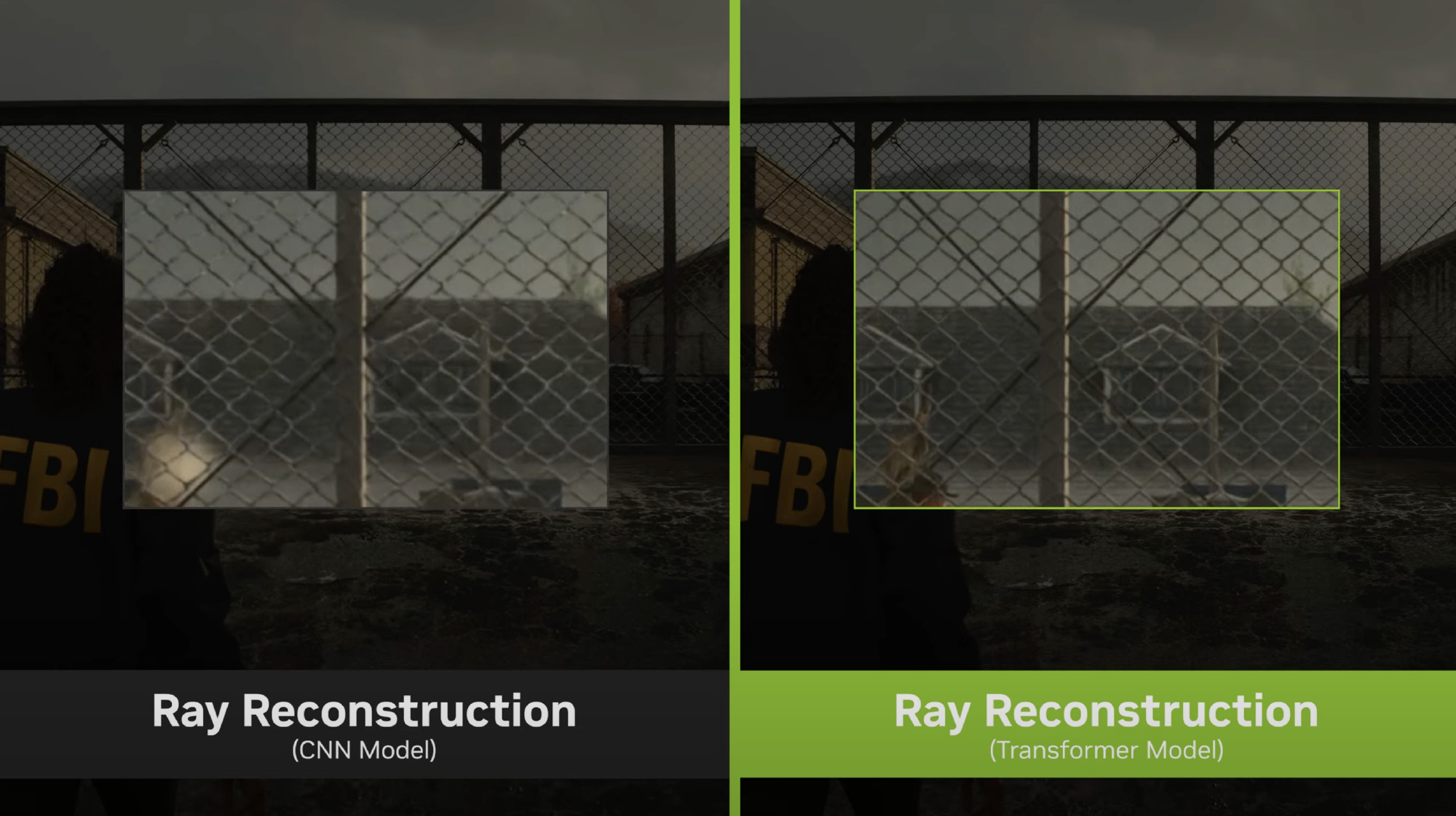 NVIDIA 官方给的对比视频里,铁丝网围栏的场景确实很典型,之前的 CNN 方法会有更多重影和闪烁,边缘也不够平滑,但是 DLSS 4 就像是原生的帧就长那样一样。